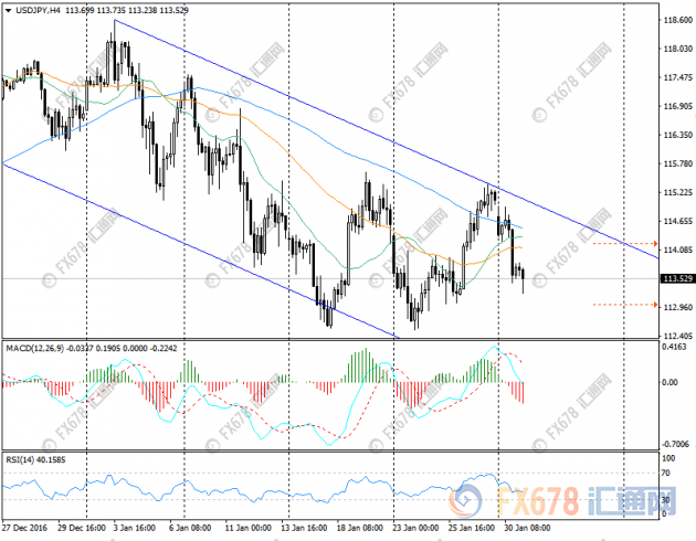 下方支撑位关注1月24日低点112.51,以及112整数关口附近。上方阻力位关注20周期均线113.45,114整数关口以及1月27日高点115.36附近。