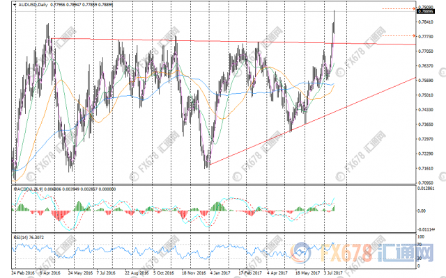 周二(7月18日)亚市,' 澳元兑' 美元表现抢眼,升至2015年5月初以来高位至0.7887,并具有进一步上行趋势,主要因' 特朗普医改法案或将难以通过打压美元回落,支撑澳元等非美货币走强,同时澳洲联储公布的会议纪要偏乐观以及中国6月份一二线城市房价同比涨幅继续回落,加速了澳元的升势。
