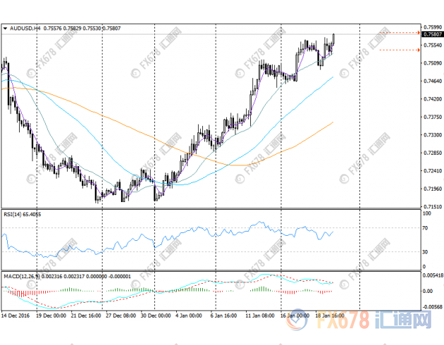 下方支撑位关注,目前日内低点0.7553,20小时均线0.7545,100小时均线0.7520和0.75关口附近。