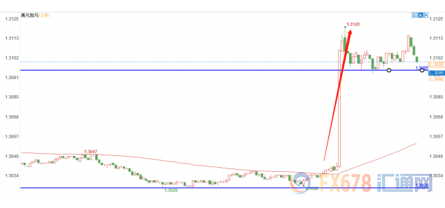 北京时间周五(10月19日)20:30,加拿大8月零售销售月率与加拿大9月CPI月率均不及预期,' 美元兑' 加元短线冲高80点,强势升破1.3100关口,刷新自9月11日来高位至1.3120。截至当前,汇价报1.3105,日内涨幅0.15%。