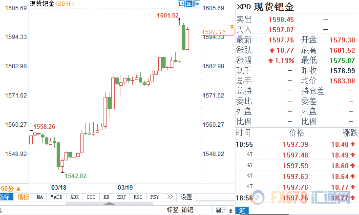 周二(3月19日)欧市盘中,现货钯金窄幅震荡走高后升破1600' 美元,现略微回落交投于1593美元附近。