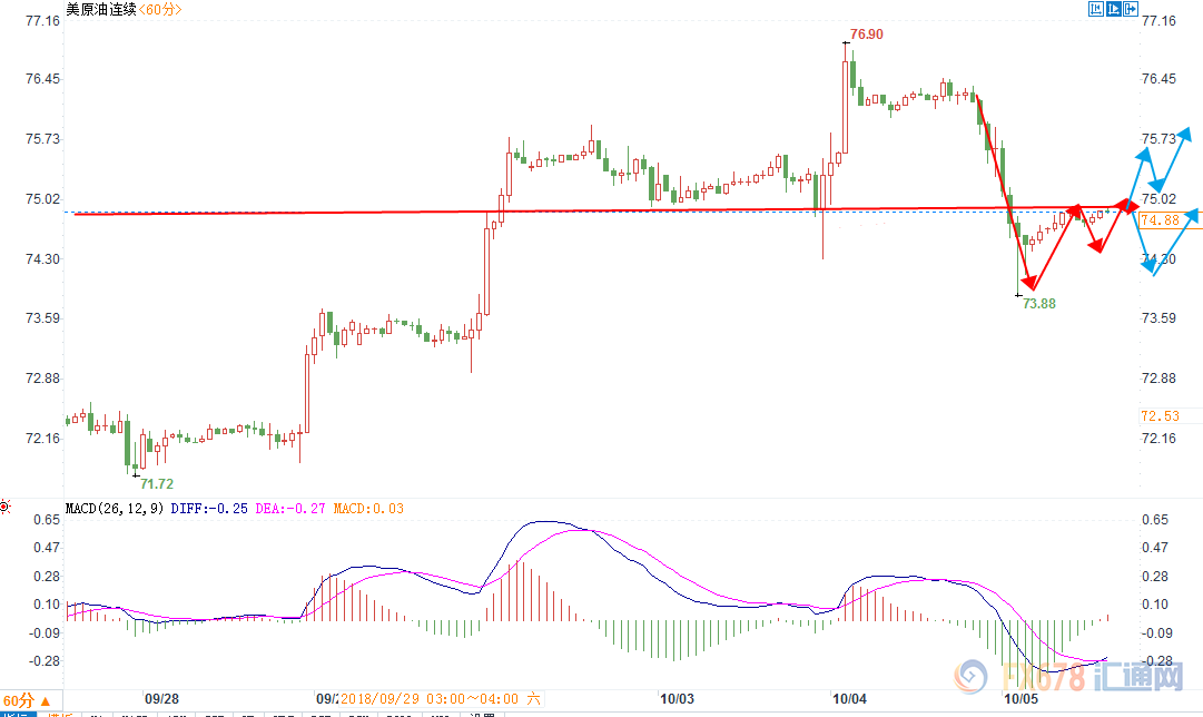 而美原油近期从76.9美元的高位迅速下杀至74美元下方,也意味着美油短期有筑顶的迹象,因此短期内美原油仍有进一步下行的空间。