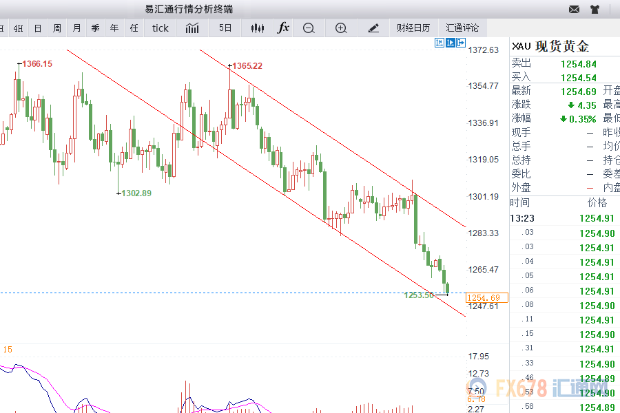 从日线图形看黄金自1366一线下跌以来,跌幅超1000点,从历史数据看无论涨跌,幅度超1000点以上则随时会有纠偏的行情出现,而下跌通道下沿维持在1249至1252区间,从4小时周期看暂时没有止跌信号,但15分钟以及小时图形的背离极有可能推动成4小时级别的背离,因此我们日内关注1252至1255区间的多头布局机会,一旦破位1249至1247一线则下一支撑在1240