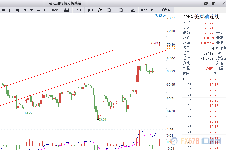 今晚重磅数据中我们关注' EIA的表现,隔夜原油继续飙升,受到出口的不确定性,以及美国的言论影响WTI站上70.4至70.6区间,今晚重点关注70.3一线支撑,一旦下破则将会产生短线回调的风险,上方一旦给出新高则不排除短周期背离修正的情况存在。