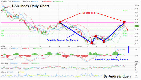 nload=imgresize(this); >从技术面看美元走势,有形成一个下跌蝙蝠形态的迹象,95大关又没上破,后市下行可能性增大。美元后市走弱可能性增大,美元回流美国的可能性也相继减低。