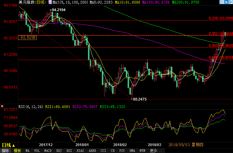 在连续三个交易日收涨后,美指回吐部分涨幅,交投于92.50下方,因多头进行部分获利了结,但仍持稳于92里程碑式的整数关口上方。隔夜美联储5月决议如期维稳,美指先跌后涨后刷新年度高点92.84,并向上突破始于2017年1月高点的下降趋势线。
