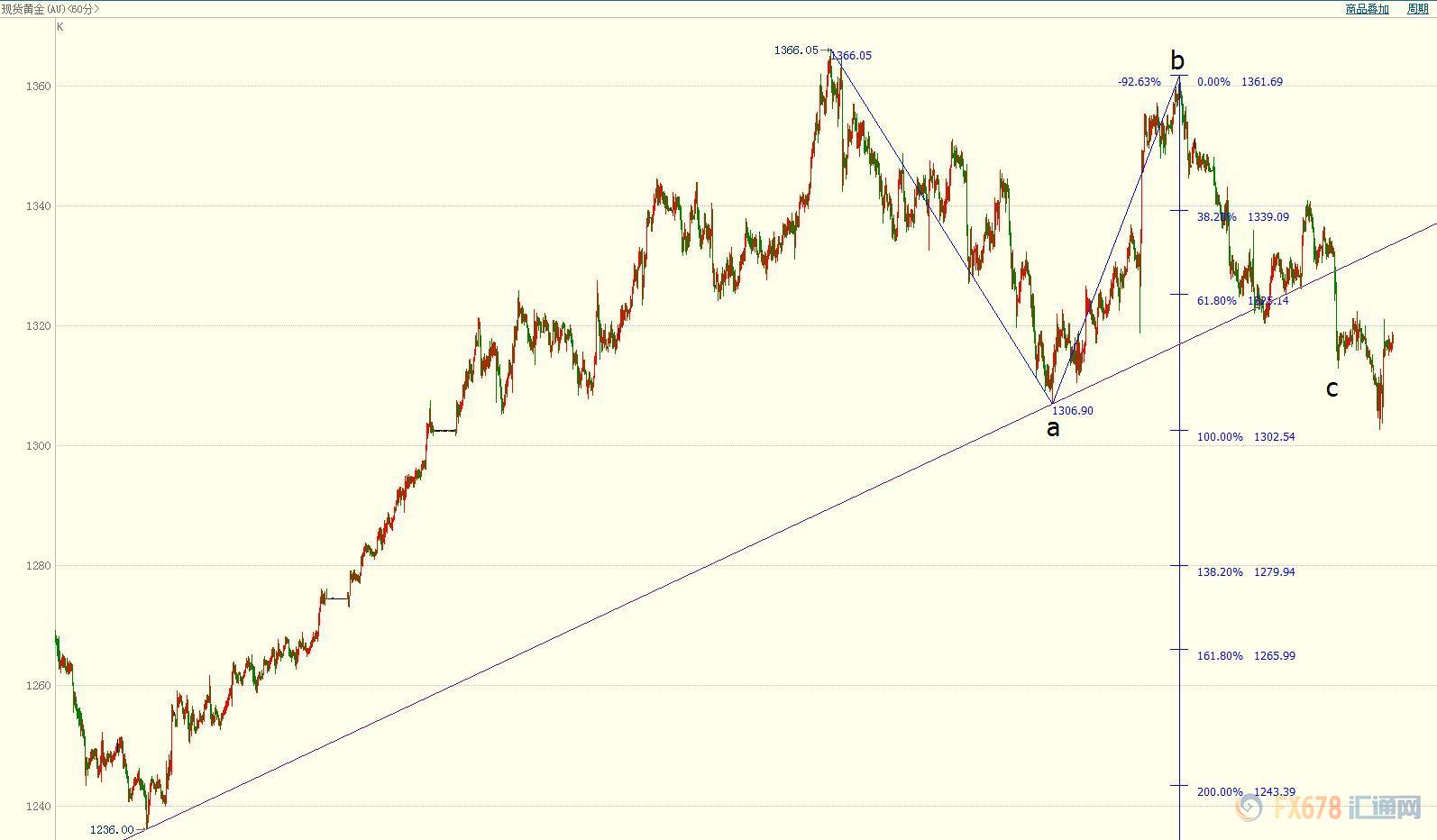 现货黄金或进一步反弹至每盎司1325-1332美元区间,此前现货黄金未跌破1303美元的支撑位。该支撑位是始于1361.76美元下行c浪的100%预测位。该c浪或已完成。