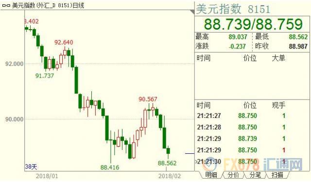 美元指数周三(2月14日)盘中一度飙升,但很快便掉头向下,终盘收跌逾0.8%,并刷新2月2日以来低点,颓势延续至今。