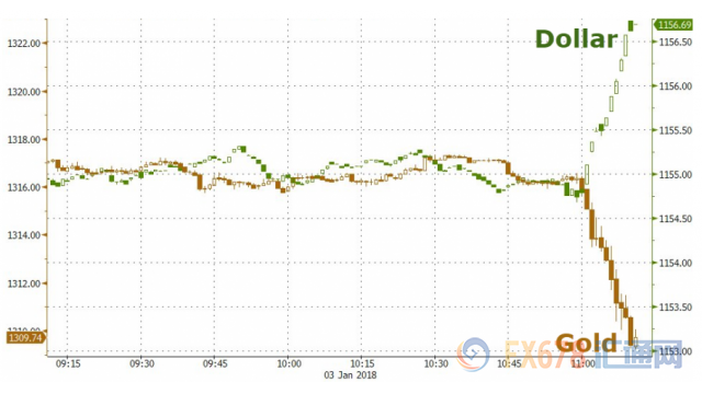 在美联储会议纪要公布后,为近期疲软的' 美元带来新的驱动因素,美元指数刷新日高至92.26,涨0.43%。随着美元上涨,市场投资者对于黄金的避险需求减弱,金价短线急跌近80点,金价跌破1310美元/盎司,刷新日内新低。截至目前,现货黄金交易价格位于1309附近。