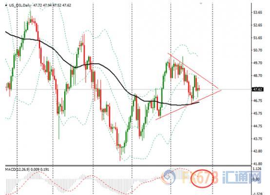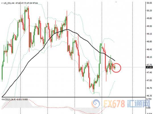 nload=imgresize(this); >在美油价格4小时图中,我们可以看到油价目前维持明显的震荡模式。但是需要留意的一点是,目前价格跌至了布林带中轨和60日均线的下方,这表明油价有向下运动的迹象。不过,下方MACD指标告诉我们油价目前运行在均衡位置,表明油价仍然有震荡调整的需求,料在晚间EIA数据公布前,这种震荡模式会延续。整体来看,油价在4小时图中走势震荡,并有向下突破的迹象出现。