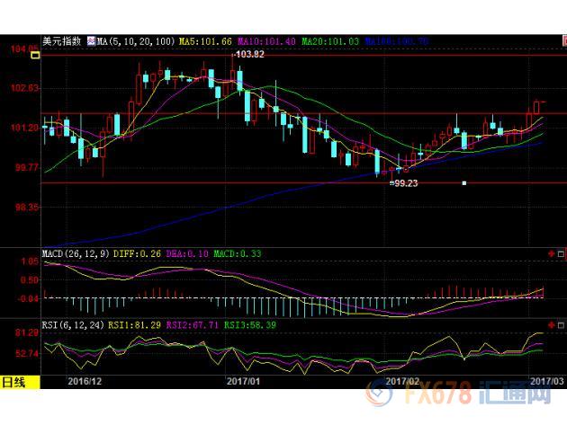 2017 年1月12日以来高点至102.27,令金价再次跌破1244美元的阻力位,并一度逼近布林线中轨1230美元附近的额支撑。