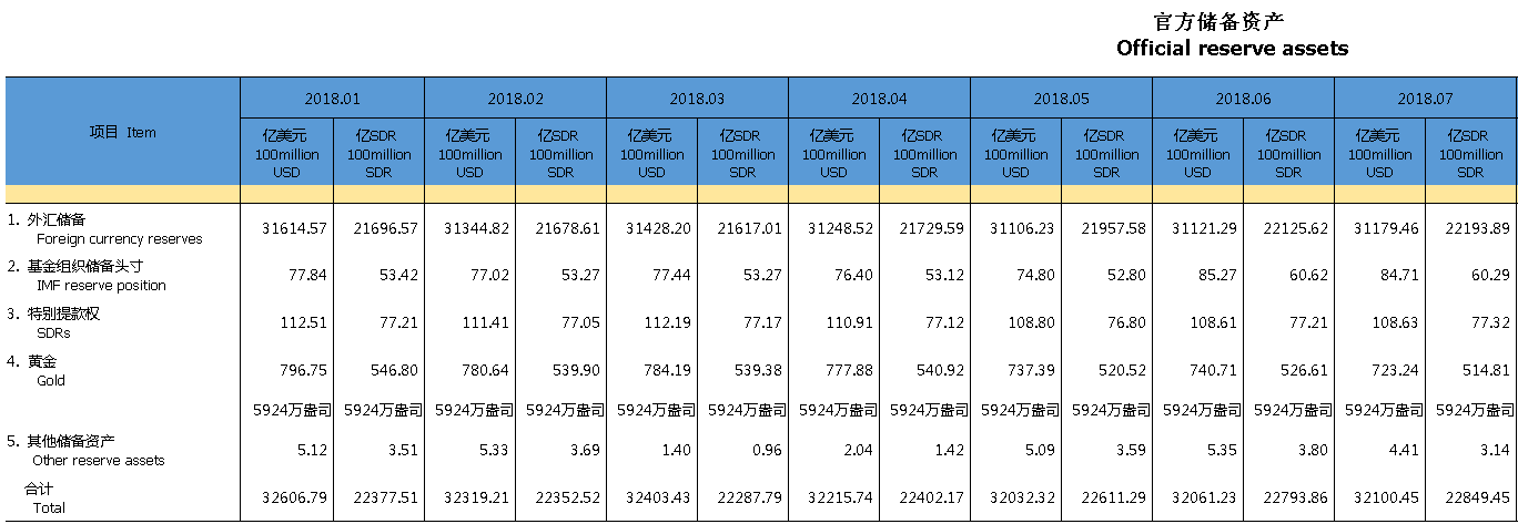 nload=imgresize(this); >数据还显示,中国7月末黄金储备报5924万盎司(约1842.57吨),与6月末持平;7月末官方储备资产中黄金储备723亿美元,6月末为740亿美元;中国7月末外汇储备报SDR2.2194万亿,6月末为SDR2.2126万亿。