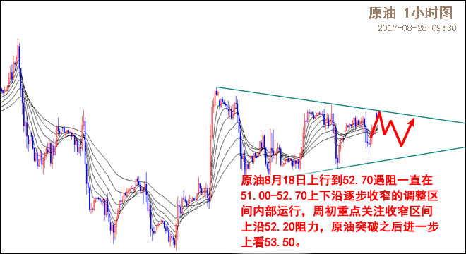 原油日线图在53.50遇阻以高位调整局面运行,随着调整时间的延长,未来原油进一步上看54.10。从小时图走势来看,原油8月18日上行到52.70遇阻一直在51.00-52.70上下沿逐步收窄的调整区间内部运行,周初重点关注收窄区间上沿52.20阻力,原油突破之后进一步上看53.50。短线支撑51.00,50.50;阻力52.70,53.50。