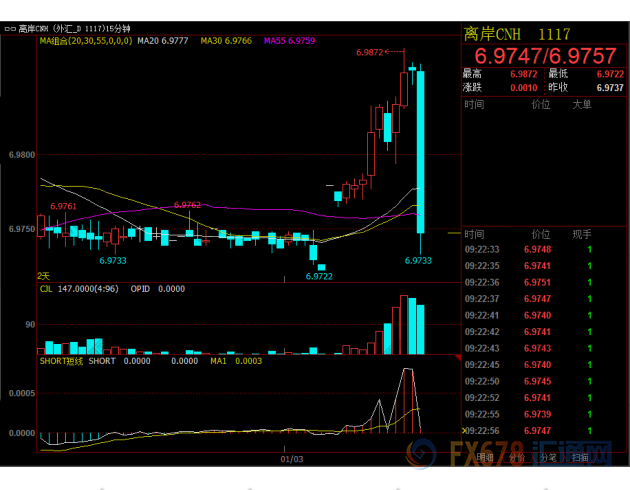 北京时间9:21,离岸人民币兑美元大幅上涨近百点,上破6.98元关口,现交投于6.9735元一线。