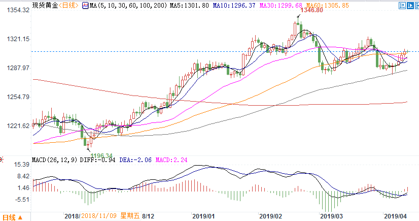 现货黄金4月10日一度升至近两周来最高位1310.67' 美元/盎司,因投资者担心全球经济和贸易紧张局势,且' 欧洲央行和' 美联储提供货币政策将继续宽松的迹象。不过,欧盟最终同意' 英国延期脱欧至10月底,令市场避险情绪有所降温,现货黄金价格小幅回落,最新交投于1307美元/盎司附近。机构认为,因为央行购金热情不减、贸易紧张局势、全球经济增长放缓风险、地缘政治不确定性加剧等因素,依然看好金价长期走势,年底有望冲击1500美元。