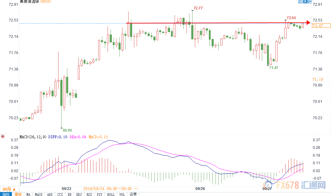 亚盘时段,美原油现报72.45美元,涨幅1.24%。美国' 能源情报署(EIA)在报告中称,截至9月21日当周,美国国内原油库存增加185.2万桶,市场分析师原本预期油价将下跌127.9万桶。此外,汽油库存增加153万桶,精炼油库存减少224.1万桶,库欣地区原油库存增加46.1万桶。