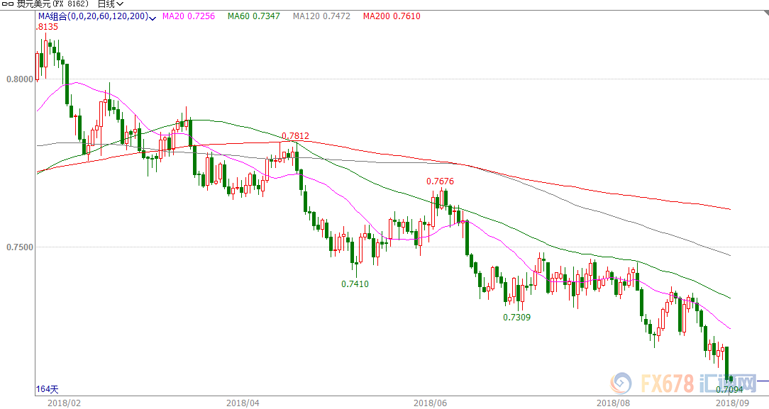 在澳洲经济总体疲软同时中美贸易纷争还在继续发酵中,澳元走势比较颓靡,而上周五非农数据亮眼则加剧了澳元的跌势,使得澳元跌破了关键支撑位0.7100一线。尽管今日中国8月CPI年率、PPI年率好于预期,澳元兑美元小幅上涨,但是仍处于看跌通道内,短时间下行的走势将延续。