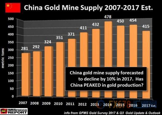 2017年我国黄金产量为426.14吨(不含进口原料产金),与去年同期相比减少27.34吨,同比下降6.03%,是1974年以来首次出现的年降幅超过5%的下降,但我国黄金产量仍继续稳居全球首位,自2007年以来已连续11年位居全球第一。黄金产量下滑的主要原因是:国内黄金企业矿石品位下降,低位的黄金价格使得黄金矿山企业的盈利空间进一步减小;相关省区先后出台了自然保护区内矿业权清理工作方案,矿山企业面临的环保压力空前,部分黄金矿山企业减产或关停整改,山东、江西、福建等重点产金省的黄金产量都出现了不同程度的下降。