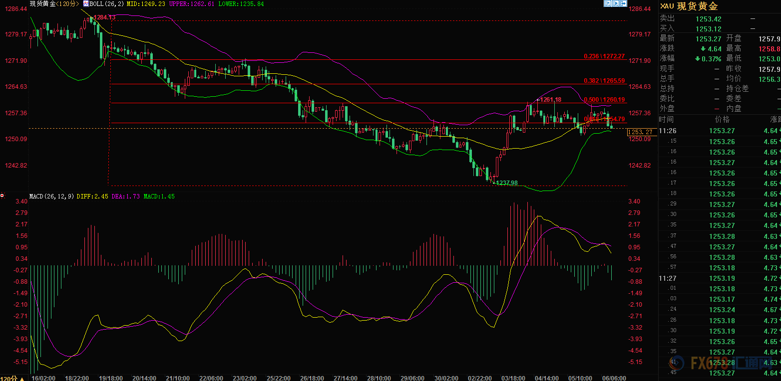 下方支撑在1250附近,为布林线下轨和前期支撑平台的双支撑,上方破1260则高看至1266和1272分别对应斐波那契0.382和0.236的数值位置。