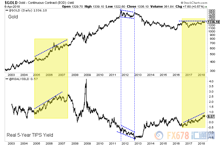 首先,我们来看一个以市场为基础的名义国债利率指标,指标以美国财政部每日公布的国债收益率为准。下面是黄金与5年期国债收益率,最近触及了8年的高点。有趣的是,黄金价格却一直保持坚挺。