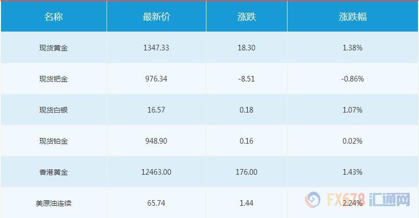美原油连续上周五收盘上涨1.44点,涨幅2.24%,报65.74点。现货钯金上周五收盘下跌8.51点,跌幅0.86%,报976.34点。