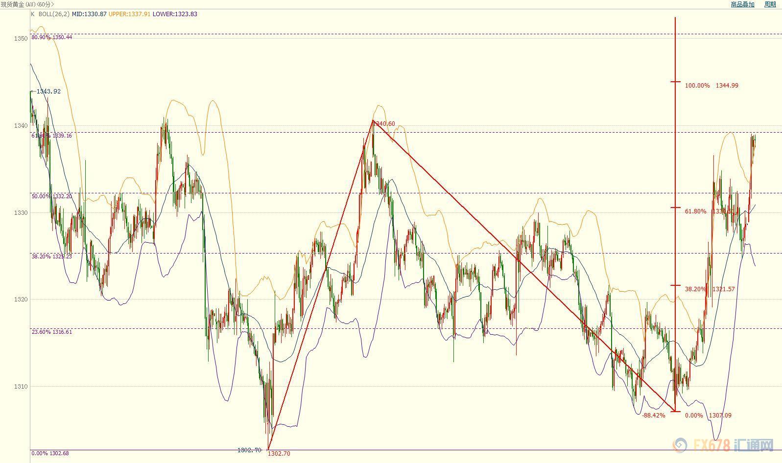 1小时K线图上看,现货黄金反弹已上破布林通道上轨,但同时逼近前期跌幅(1361.69-1302.70美元区间)61.8%斐波那契分割位1339.16美元以及1340美元整数关口,轧空走势能否开启仍存在变数。