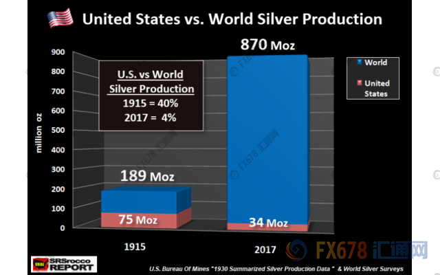 然而,2017年美国白银产量将仅为34万盎司,而全球估计为870万盎司。因此,美国的白银产量仅占世界矿产供应量的4%,而1915年有40%,这是这100年来的变化。 【免责声明】本文仅代表作者本人观点,与汇通网无关。汇通网对文中陈述、观点判断保持中立,不对所包含内容的准确性、可靠性或完整性提供任何明示或暗示的保证,且不构成任何投资建议,请读者仅作参考,并自行承担全部风险与责任。