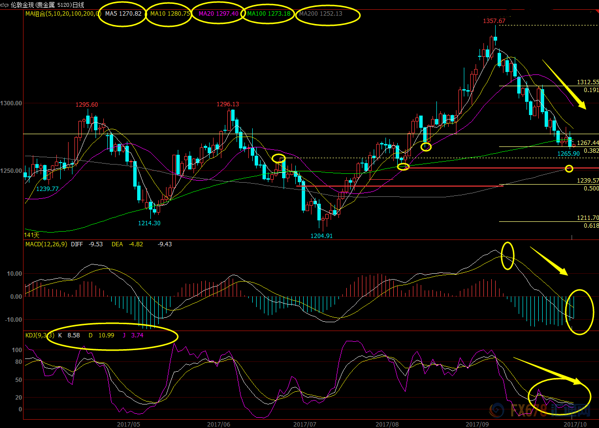 从日线图来看,上日金价收跌再次失守100日均线1273附近支撑,均线重回空头排列,反弹信号被破坏,目前勉强在1267附近获得支撑,该位置是1122-1357涨势的38.2%回撤位支撑,但多个技术指标看空信号仍存,在收复100日均线前,倾向于看空后市,初步支撑在1204-1357涨势的61.8%回撤位1263.3附近;6月23日高点1259.05附近也存在些许支撑;200日均线支撑在1252.13附近。
