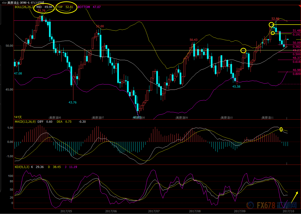 因MACD死叉信号仍在,若意外跌至5日均线50.42下方,则加强短线下行风险;届时油价可能会在49.50-51.20区域震荡后再选择新的方向,49.50为200日均线支撑所在。