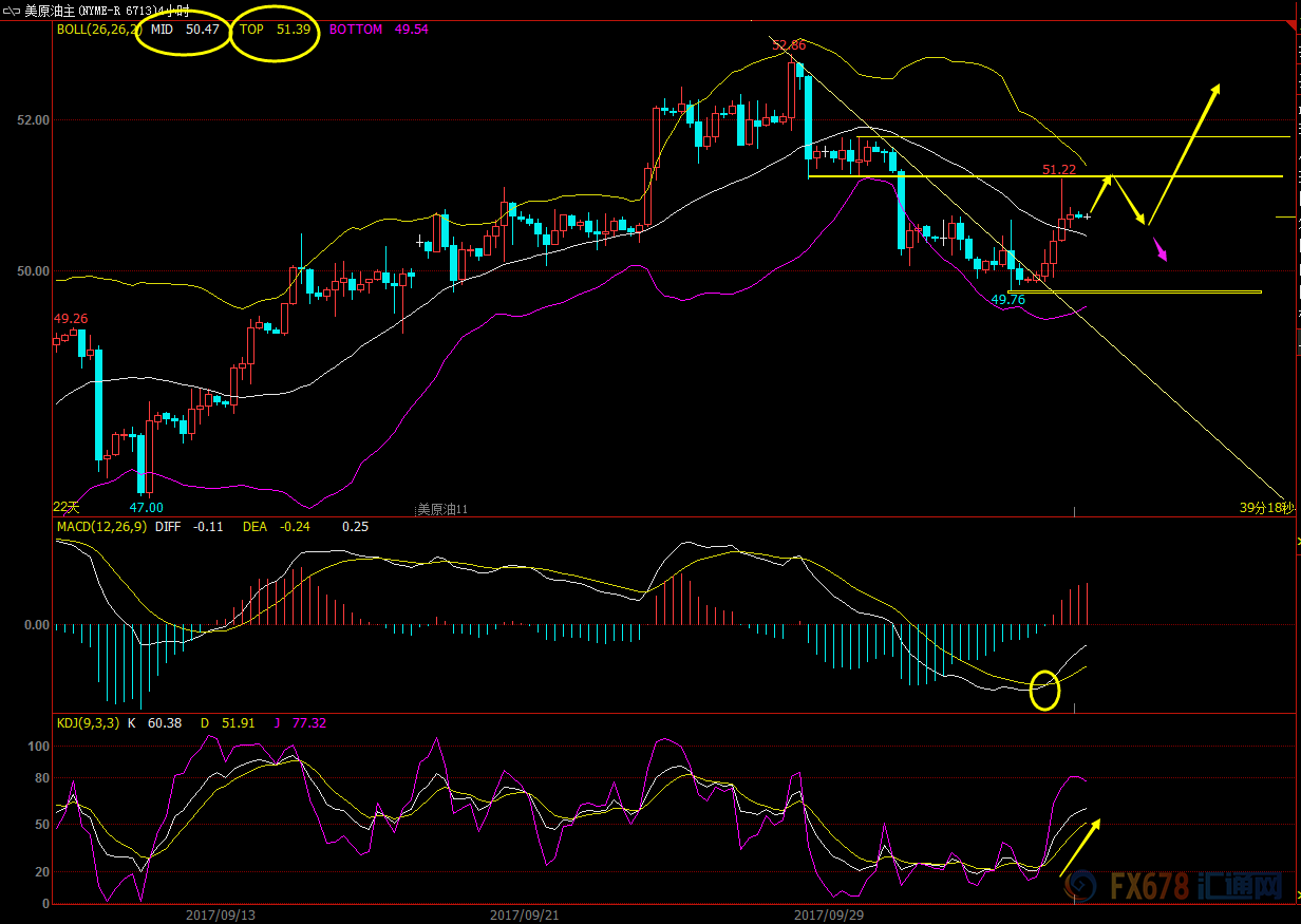 从日线图来看,油价在布林线中轨获得支撑并展开反弹,收复了5日均线50.42附近阻力,该位置也是7月份高点阻力所在,再失守该位置前,倾向于看涨后市;虽然10日均线51.16附近阻力仍存,仍若能顶破该位置,则油价有望重拾中线涨势。