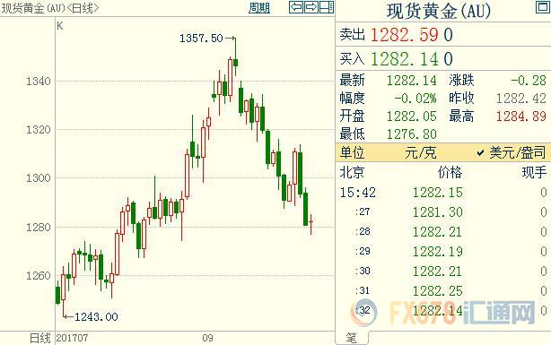 汇通财经易汇通行情软件显示,北京时间15:40,现货黄金报1282.45美元/盎司。 【免责声明】本文仅代表作者本人观点,与汇通网无关。汇通网对文中陈述、观点判断保持中立,不对所包含内容的准确性、可靠性或完整性提供任何明示或暗示的保证,且不构成任何投资建议,请读者仅作参考,并自行承担全部风险与责任。