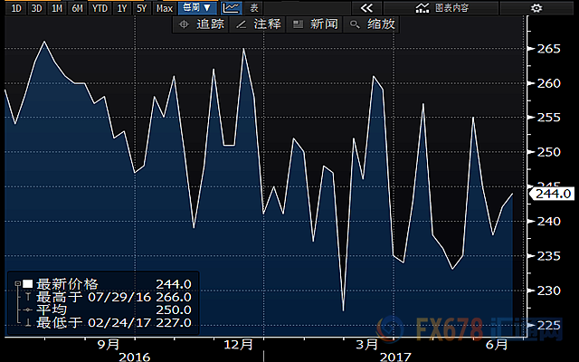 本周三' 欧洲央行、' 英国央行、加拿大央行均表示未来将缩减宽松政策,这也预示着主要央行正在追随' 美联储进入加息大潮,虽然日本央行还是维持宽松,但有迹象表明,日本央行也在暗地里减少购债规模。黄金多头也开始预感到苗头不对,昨日(6月29日)在美元暴跌之即,竟然还跌破了1250美元/盎司水平位,退守到1240美元/盎司附近观望,截至发稿,仍在该水平附近辗转。
