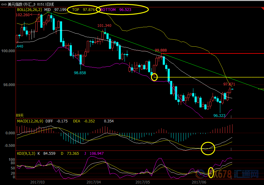 周三(6月21日)' 美元指数仍在近一个高位附近震荡,短线有望小幅冲高,而现货黄金温和反弹,能否顶破5日均线阻力还有待观察;' 英镑和' 原油则仍有进一步下行风险;' 澳元重回跌势的风险亦在加大。