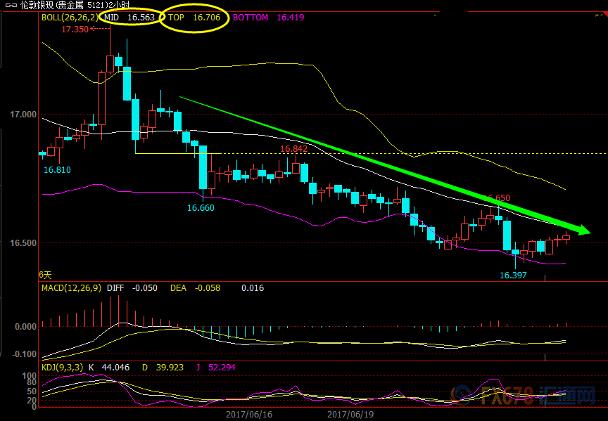 从2小时来看,银价受到布林线中轨的压制较为明显,目前在16.563附近,若再次突破失败,银价料将延续跌势并再创新低;但若顶破布林线中轨阻力,在关注布林线上轨16.706附近的阻力。