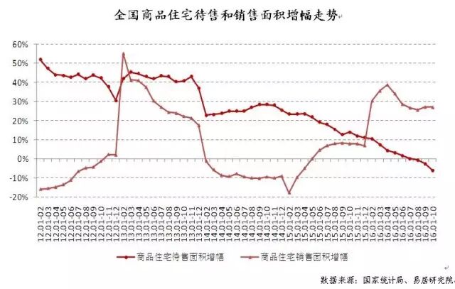 10月密集调控之后,近期又有杭州与武汉升级了调控,但增量力度并不大。估计主要是承受了来自上层的压力,无奈之下再表态。 近日,国家统计局公布了10月份的全国房地产数据,易居研究院的一份常规报告对此进行了分析。在此,老杨摘出两图,与大家分享一下,当前中国楼市的一条喜讯与一个恶兆。 一条喜讯:全国库存连降八个月! 10月末,全国商品房待售面积69522万平方米,比9月末减少90万平方米。其中,住宅待售面积减少328万平方米,办公楼待售面积增加43万平方米,商业营业用房待售面积增加104万平方米。 从10月末的商品房库存量来看,已连续八个月出现减少,去库存效果显现,其中住宅去化效果最为明显,而商办类依然堪忧。 2015年11月,中央提出去库存,将其列为2016年全国经济工作的五大目标之一:去产能、去库存、去杠杆、降成本、补短板。其后,各省出台去库存政策,下发文件。 今年以来,全国商品房待售面积持续下滑,说明去库存初见成效,因此老杨将2016称为去库存元年。 从数据分析的角度,单看待售面积下滑,还不够深入,将销量增速与库存增速相比较,才能洞悉库存变化的内在运行机制。 10月末,商品住宅待售面积同比下降6%,而这条增幅曲线,自2012年以来就一直振荡式下行,并于今年三季度转为下跌。 今年前10个月,全国商品住宅销售面积同比增长27%,这条曲线自2015年初见底后振荡上行。 两条曲线在2015年12月完成交叉,这是一个关键时点,是两股势力交锋的逆转点!而这一时点,正是中央提出去库存后的第二个月!不得不佩服,咱政府的意志和效率,实在太强大!