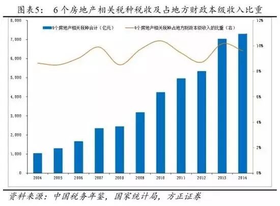 除房地产行业特有的税种外,土地财政还包括6个与房地产相关的税种。这6个税种无法直接获取,但可以从分项目中间接获取。包括教育附加费、城市维持建设税、" 房地产企业营业税、" 房地产企业所得税、房屋转让个人所得税和印花税。这6个房地产业相关的税种税收合计,从2004年的1028亿元,上升到2014年的7294亿元,增长7倍。2014年,6种税种税收合计占地方财政本级收入的比重为9.61%。