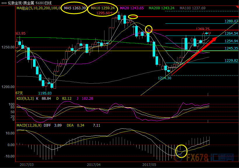 从日线来看,均线出现轻微的多头排列,MACD零轴下方的金叉良好运行,KDJ虽然处于超买区,但短线并没有结成死叉的迹象,5月9日以来的上涨趋势线支撑仍然完好,暗示金价有望延续涨势,但5月1日高点1271美元附近仍存在较强的阻力,若能顶破该位置阻力,金价有望上探布林线上轨1282.09美元附近的阻力。