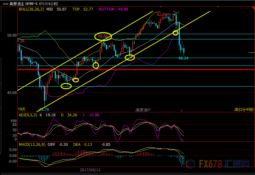 从4小时来看,油价跌破了近期的上涨通道,而且失守布林线下轨支撑,布林线开口,MACD快线已经下穿零轴,慢线亦有该趋势,这是继续看跌的信号,不过48.05美元附近的支撑较强,KDJ已经发出超卖信号,虽然在单边下跌行情中有效性不强,短线回调仍值得期待,但一般而言抢反弹风险较高,不建议轻易尝试;上方关注49.66美元附近的阻力;下方进一步支撑在47.35美元附近,47.01美元附近,45.53美元附近。