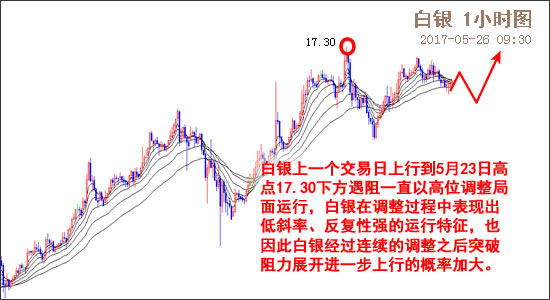 白银日线图反弹到55均线附近并没有出现快速的回落,而是一直围绕反弹高点调整,这也表明近期白银的反弹尚未结束,接下来仍有反弹空间。从小时图走势来看,白银上一个交易日上行到5月23日高点17.30下方遇阻一直以高位调整局面运行,白银在调整过程中表现出低斜率、反复性强的运行特征,也因此白银经过连续的调整之后突破阻力展开进一步上行的概率加大。短线支撑17.00,16.85;阻力17.30。