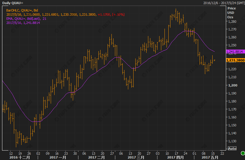 昨日(5月15日)对于黄金市场来说,好坏消息参半,黄金自亚市一路反弹,在纽约时段,' 美国经济数据不佳的提振之下,一度逼近1240美元/盎司,随后冲高回落,截至周二(5月16日)发稿,现货黄金震荡交投在1230美元/盎司附近。因朝鲜地缘局势,暂无恶化消息,市场避险意愿有限。且欧洲方面,' 法国新总理任命符合市场预期以及' 德国地方选举进展顺利,也打压了市场的避险激情,令黄金坐上“过山车”。
