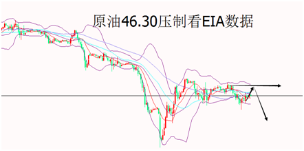 原油隔日在46.80压制之下走低,最低在45.50附近,下跌力度在1.3美金,在早间API的数据影响之下,原油走出反弹收线在46.20附近,虽然原油在周期中走出大跌反弹,但趋势力度不变,继续看空。从技术面上看,原油不破日线单边均线压制47.30不看多,日线收银,表现长下影线,只能说原油在低位走震荡力度比较明显,空头延续,今日继续做空即可,至于地位是否破位则需要看EIA数据。从小周期上看,日内挂着农户46.30压制,继续做空,下方看45.60-45即可。预计EIA力度先涨后跌,区间放在46.80-45。日内具体操作可看:46.30做空,45.10做多。