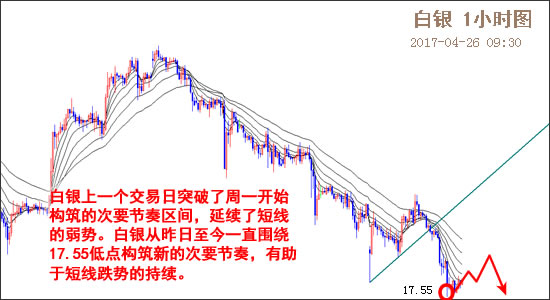 白银中期冲高到18.65遇阻也出现了快速的回调,限制了去年12月以来涨势的进一步展开。从小时图走势来看,白银上一个交易日突破了周一开始构筑的次要节奏区间,延续了短线的弱势。白银从昨日至今一直围绕17.55低点构筑新的次要节奏,有助于短线跌势的持续。白银短线阻力17.75,18.00。