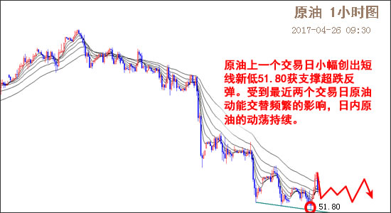 原油日线图延续了4月12日以来的区间内下落局面,原油下落获支撑收出一根带有较长上下影线的k线,限制了原油近期区间内下落空间的进一步展开。从小时图走势来看,原油上一个交易日小幅创出短线新低51.80获支撑超跌反弹。受到最近两个交易日原油动能交替频繁的影响,日内原油的动荡持续。原油短线支撑51.80,阻力53.70。