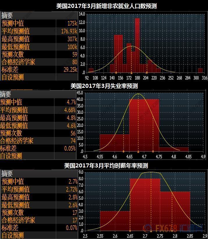 nload=imgresize(this); >(图1:截至2017年4月2日,对于美国3月非农就业报告的三项关键指标预测情况,汇通财经)