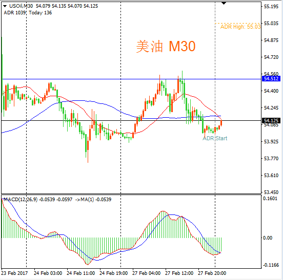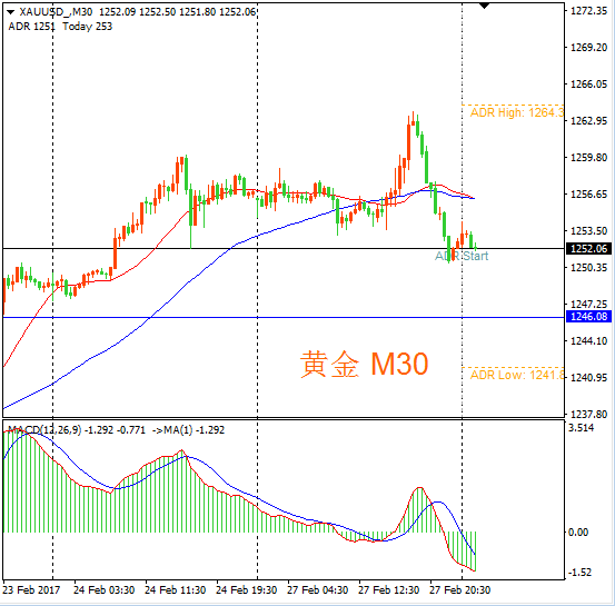 隔夜金价冲高回落,在耐用品订单分项数据及新屋销售数据表现不佳之际,一度短线升至1263.6,刷新三个半月高点至1253.48美元/盎司,但由于' 美联储票委卡普兰继续发表鹰派讲话,美联储3月份加息概率升至50%,令部分多头获利了结,市场还在等待' 特朗普的国会的讲话,金价究竟能否一飞冲天?就得看特朗普大嘴里放出什么炮了。