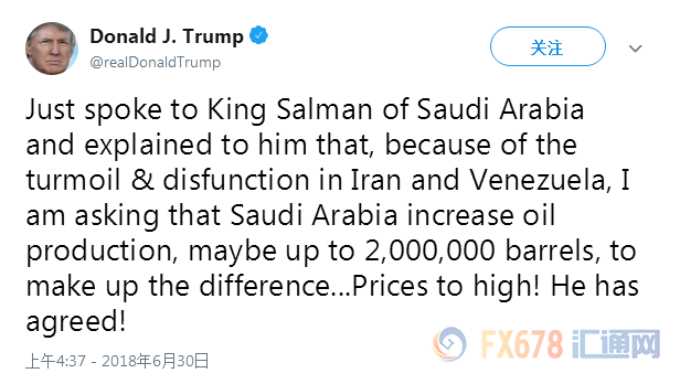 在OPEC会议决定增产后几乎不到一周,特朗普6月30日在推特上表示,他与沙特国王萨勒曼通了电话,要求沙特增加石油产量,或许增加200万桶/日,以弥补伊朗和委内瑞拉造成的供应短缺。特朗普称:“油价太高了!他已经同意增产。”