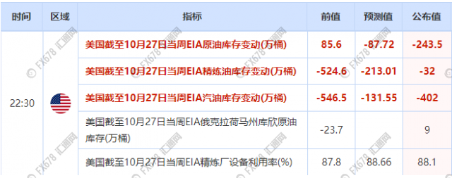 日内早些时候,API公布库存数据,截至10月27日当周,美国原油库存减少509万桶,至4.568亿桶,分析师预估为减少257.5万桶;库欣原油库存减少26.3万桶,预期减少5.5万桶;汽油库存减少769.7万桶,调查预估为减少205万桶;上周精炼油库存减少310.6万桶,预估为减少245万桶。