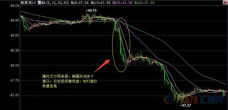 ' 美国WTI 10月' 原油' 期货电子盘价格周五(9月8日)收盘下跌1.55' 美元,跌幅3.16%,报47.56美元/桶。美国原油价格周五急挫逾3%,因担心艾尔玛飓风会严重打击' 能源需求,专家称艾尔玛是一个世纪来威力最大的飓风之一。