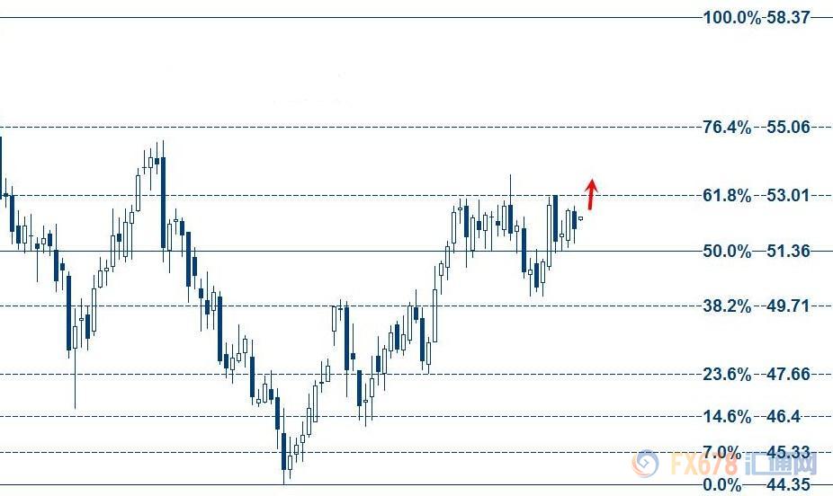 然而在抵达53.30美元前需突破另一道阻力,即从6月21日低位44.35美元至8月10日高位53.64美元的7%费波纳奇回档位。