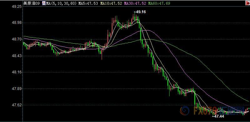 ' 美国WTI 9月' 原油' 期货电子盘价格周一(8月14日)收盘下跌1.28' 美元,跌幅2.62%,报47.51美元/桶。油价周一下跌超过2.5%,盘中交投震荡,因美元上涨和中国炼厂加工数据疲弱,打压油价,对利比亚供应可能减少的担忧在盘中短暂提振油价。